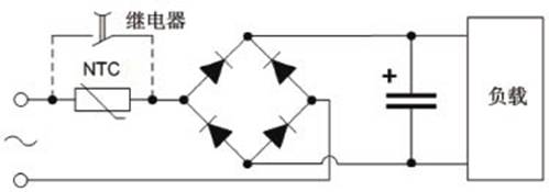 假設(shè)輸入電壓V1為220Vac,整個(gè)電網(wǎng)內(nèi)阻(含整流橋和濾波電容)Rs=1Ω,若正好在電源輸入波形達(dá)到90度相位的時(shí)候開(kāi)機(jī),那么開(kāi)機(jī)瞬間浪涌電流的峰值將達(dá)到I=220×1.414/1=311(A)。這個(gè)浪涌電流雖然時(shí)間很短,但如果不加以抑制,會(huì)減短輸入電容和整流橋的壽命,還可能造成輸入電源電壓的降低,讓使用同一輸入電源的其它動(dòng)力設(shè)備瞬間掉電,對(duì)臨近設(shè)備的正常工作產(chǎn)生干擾。