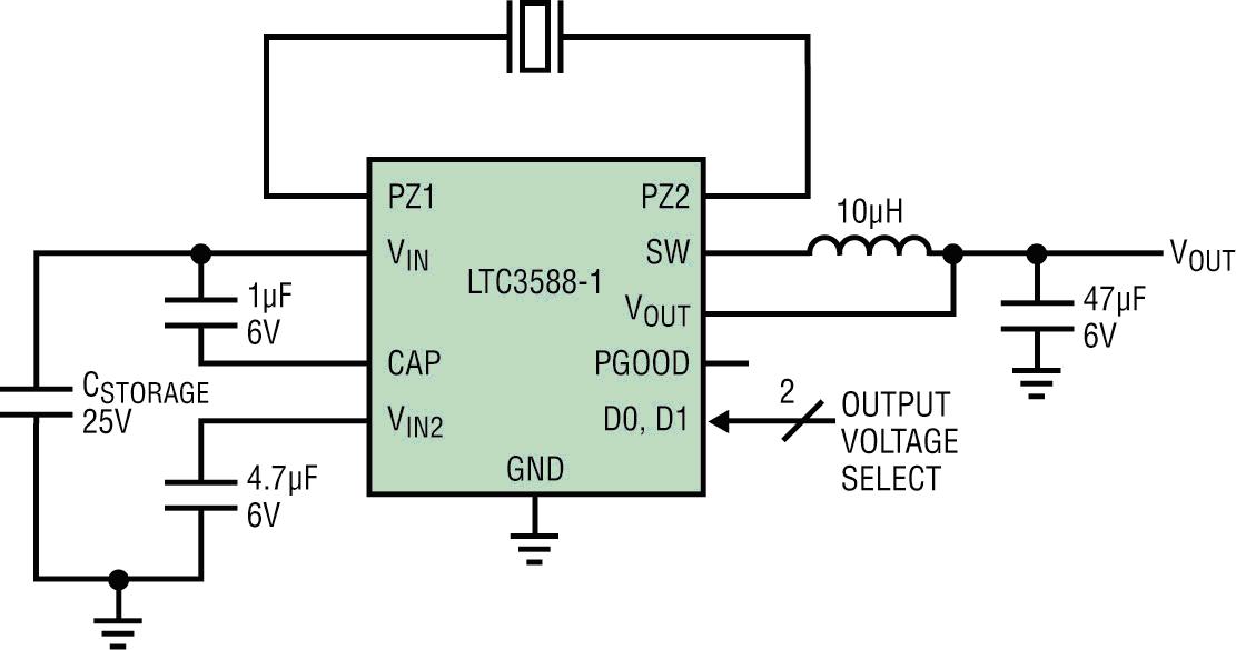 LTC3588-1 是一款完整的能量收集解決方案,專為包括壓電式換能器在內(nèi)的低能量源而優(yōu)化。壓電器件通過器件的擠壓或撓曲產(chǎn)生能量。視其尺寸和構(gòu)造的不同,這些壓電元件能產(chǎn)生幾百 μW/cm2 的功率。