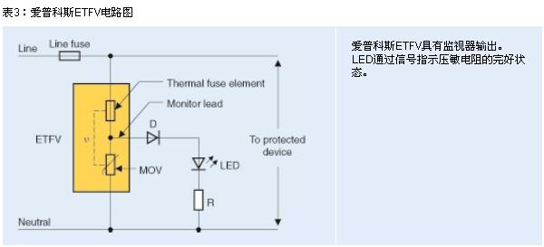 為使太陽能逆變器制造商以低成本滿足各大標準及保險公司的嚴格要求,TDK-EPC現(xiàn)開發(fā)出 ETFV系列(愛普科斯熱熔式壓敏電阻)。這些組件通過串聯(lián)電路組合在一起,包括一個壓敏電阻和一個熱熔絲。如果壓敏電阻已嚴重退化,并致使較高漏電流導(dǎo)致過熱,熔絲將熔斷以斷開壓敏電阻。上述元件的一大特色便是監(jiān)視引線:通過延伸壓敏電阻與熱熔絲之間的觸點以驅(qū)動LED(參見圖3)。