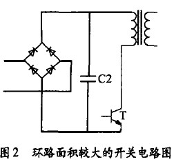 電源工作時(shí),整流二極管處于高頻通斷狀態(tài),由脈沖變壓器、整流二極管以及濾波電容構(gòu)成的高頻開關(guān)電流環(huán)路,可能向空間輻射噪聲。