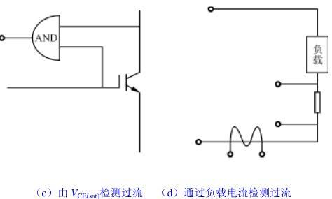 此方法與圖5(a)中的檢測方法基本相同,但圖5(a)屬直接法,此屬間接法,如圖5(d)所示。若負(fù)載短路或負(fù)載電流加大時,也可能使前級的IGBT的集電極電流增大,導(dǎo)致IGBT損壞。由負(fù)載處(或IGBT的后一級電路)檢測到異常后,控制執(zhí)行機(jī)構(gòu)切斷IGBT的輸入,達(dá)到保護(hù)的目的。