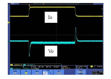 系統(tǒng)的帶寬是影響系統(tǒng)動態(tài)響應(yīng)的重要因素,相位裕度是影響系統(tǒng)穩(wěn)定性的重要因素。如果選擇不同的Rf1,系統(tǒng)的帶寬和相位裕度會產(chǎn)生變化,也就是動態(tài)響應(yīng)和穩(wěn)定性會發(fā)生變化。具體以表1來分析,當(dāng)Rf1從300k變到750k,系統(tǒng)地帶寬從51.1kHz變到26.1kHz,因此系統(tǒng)的動態(tài)響應(yīng)會相應(yīng)的變差,而由于相位裕度都是足夠的,因此系統(tǒng)都處于穩(wěn)定工作的狀態(tài)。圖7和圖8是做負(fù)載切換的動態(tài)響應(yīng)測試結(jié)果,從測試結(jié)果可以看出環(huán)路響應(yīng)速度變慢,導(dǎo)致輸出電壓過沖變大,動態(tài)響應(yīng)效果變差。