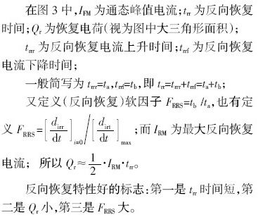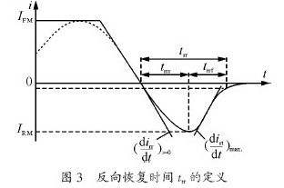 由整流二極管的國際標(biāo)準(zhǔn)知,反向恢復(fù)時間trr規(guī)定為:當(dāng)從正向到反向轉(zhuǎn)換時,從電流過零瞬間起,至反向電流由峰值IFM減少到規(guī)定低值瞬間(如圖3 所示)的時間間隔。