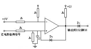如圖1所示,過流保護信號取自CT2,經(jīng)分壓、濾波后加至電壓比較器的同相輸入端,如圖4所示。當同相輸入端過電流檢測信號比反相輸入端參考電平高時,比較器輸出高電平,使D2從原來的反向偏置狀態(tài)轉(zhuǎn)變?yōu)檎驅(qū)?并把同相端電位提升為高電平,使電壓比較器一直穩(wěn)定輸出高電平。同時,該過電流信號還送到SG3525的腳10。當SG3525的腳10為高電平時,其腳11及腳14上輸出的脈寬調(diào)制脈沖就會立即消失而成為零。