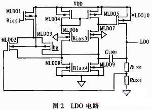 LDO在低頻時(shí)的PSR主要取決于運(yùn)放的增益,為此選擇折疊共源共柵電路。此LDO電路基于文獻(xiàn)中的電路修改,如圖2所示,并采用PSR高的偏置生成電路。