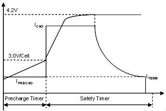 預充電安全定時器可避免長時間給電量耗盡的電池充電。一般說來,電池單元電壓達到 3.0 V,充電器就會進入 CC 階段。快速充電電流通常限定在 0.5 至 1C 之間,以避免過熱導致電池加速退化。應選擇適當?shù)乃俣龋_保電池溫度不超過 45oC,然后在快充速率下進行電池充電,直至電壓達到調(diào)節(jié)限度(對基于 LiCoO2 的陰極而言通常是每單元 4.2 V)。充電器開始調(diào)節(jié)電池電壓并進入 CV 階段,這時充電電流會呈指數(shù)地下降至預定終止水平,結(jié)束電池充電。