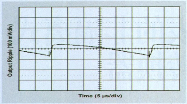 相對(duì)較高的K值最小化了電感值,并且經(jīng)證明是可以接受的,因?yàn)檫@種特殊應(yīng)用的穩(wěn)態(tài)輸出紋波要求小于0.02 × VOUT,即高負(fù)載時(shí)的100mVPP。磁滯后,TPS6420x控制器一般在輸出電壓有一些紋波時(shí)工作效果最佳,建議使用至少 50mΩ ESR的輸出電容可產(chǎn)生ΔVPP(ESR) = ΔIL × RESR的紋波電壓,其一般遠(yuǎn)超出電壓紋波的電容分量。圖2顯示了該應(yīng)用測(cè)得紋波。
