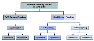 在ECS驅(qū)動饋電時,ECS決定了向電網(wǎng)傳輸?shù)墓β省H缃?,單臺RESs逆變器典型地就在這種饋電方式下運(yùn)行,并向電網(wǎng)注入全部可提供的功率。在電網(wǎng)驅(qū)動饋電時,不再是ECS,而是電網(wǎng)決定功率的傳輸。典型的,大多數(shù)常規(guī)大型電廠運(yùn)行在這種方式下,同樣,這種方式潛在的適合DERs和RESs系統(tǒng),或者至少適合混合式電力系統(tǒng)。在ECS驅(qū)動饋電的情況下,逆變器控制方式被稱作電網(wǎng)平行方式。第二種情況可以被兩種不同的逆變器控制方式實(shí)現(xiàn),分別是電網(wǎng)形成方式和電網(wǎng)支持方式。電網(wǎng)形成方式中逆變器的作用是建立和維持電網(wǎng)狀態(tài)變量。電網(wǎng)支持方式中逆變器被用于平衡功率。它可以傳輸預(yù)先設(shè)定數(shù)量的功率,這個數(shù)量可以根據(jù)電力系統(tǒng)的需要或者高級控制運(yùn)行得到的參考值進(jìn)行調(diào)整。應(yīng)用這個控制方式的逆變器例子如圖3至圖5的左側(cè)所示。此外,這些基本有功功率調(diào)控器潛在的對二次電網(wǎng)控制的相互聯(lián)系可以被類似的闡釋。