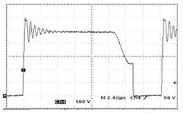 相對(duì)于一般的反激式變換器,準(zhǔn)諧振只在原來電路基礎(chǔ)上加了一個(gè)無(wú)源器件電容器,不會(huì)在電路中產(chǎn)生多余的電磁噪聲。通過改變控制方式,利用變壓器初級(jí)電感與電容器之間發(fā)生諧振,在開關(guān)管電壓波形出現(xiàn)波谷處開通;關(guān)斷時(shí)利用電容器進(jìn)行緩沖,可以大大降低開關(guān)管上的關(guān)斷電壓尖峰和開通電流尖峰,從而降低電磁干擾。利用安森美的NCP1207制作的準(zhǔn)諧振反激式開關(guān)電源,其開關(guān)管上的電壓波形如圖6所示: