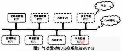 氣動發(fā)動機的控制系統(tǒng)是極其復(fù)雜的,不僅包括轉(zhuǎn)速、油門位置等信號的采集處理;還要對電磁閥的噴氣定時和噴氣量完成精確控制等等。另外,氣動汽車上還包括ABS、空調(diào)系統(tǒng)和車輛燈光等模塊,這些模塊需要實時共享車輛的數(shù)據(jù),以達到整車的最優(yōu)控制。傳統(tǒng)的電氣控制設(shè)計策略已經(jīng)不能滿足當(dāng)今電氣控制網(wǎng)絡(luò)的需要,而CAN總線的數(shù)據(jù)通訊具有突出的可靠性、實用性和靈活性等特點。氣動發(fā)動機電控系統(tǒng)通訊平臺如圖3所示。它具有布線成本低、通訊速率高和數(shù)據(jù)傳輸精度高等優(yōu)勢。