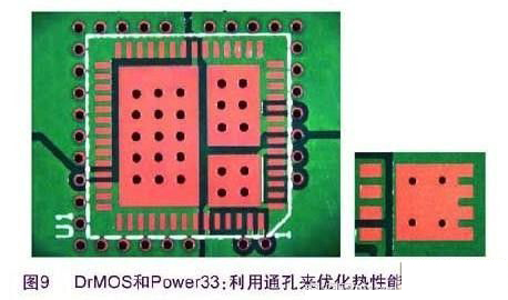 至于版圖布局,金屬較多顯然很有助益。更厚的頂層有助于降低溫度,不過(guò)也許對(duì)PCB的其余部分并不適合,因?yàn)槌杀驹黾恿耍渌枰母?xì)的間距也不可能實(shí)現(xiàn)。更大的銅面積很有用,但又會(huì)消耗PCB空間。這些應(yīng)該盡可能由焊料覆蓋,因?yàn)榻饘俦砻姹韧科岜砻娴纳嵝愿?。在多層PCB中,有時(shí)利用內(nèi)層來(lái)協(xié)助散熱。熱通孔(填充焊料)有時(shí)可用來(lái)把熱量擴(kuò)散到PCB的另一面去(圖9)。