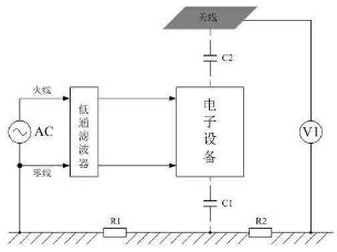 輻射干擾一般是通過電磁感應(yīng)的形式在空間進行傳播的,圖4是測試電子設(shè)備產(chǎn)生輻射干擾的基本方法,或表示電子設(shè)備產(chǎn)生的干擾信號通過電磁感應(yīng)向空中輻射的原理。圖4中,電子設(shè)備表示干擾信號源,V1表示測量儀表,C1表示電子設(shè)備對大地的電容,C2表示電子設(shè)備與天線偶合的電容,即:電子設(shè)備通過電場對天線產(chǎn)生感應(yīng),這里的天線也可以看成是被干擾的設(shè)備。圖4的測試方法就是測試電子設(shè)備周圍規(guī)定距離某處的電磁場強度,由于干擾信號一般都是一個頻率成份非常豐富的非正弦波,因此,無法對它進行直接測量,只能對它其中某一個頻率信號單獨進行測量。