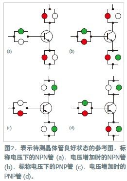 圖1中的簡單晶體管測試儀可以判斷出晶體管的類型,并且能幫助檢測出晶體管的發(fā)射極、集電極和基極。其方法是檢查被測晶體管三個端子T1、T2和T3之間流過的各種可能電流方向的組合。