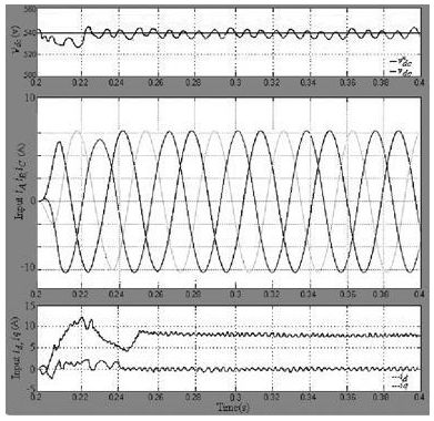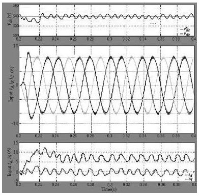 在正常工作條件下, 穩(wěn)壓器輸出穩(wěn)定的直流母線電壓和d 軸電流控制, 但是逆變器負(fù)荷不均衡, 就會(huì)產(chǎn)生波動(dòng)的直流電壓, 因此整流器在不平衡負(fù)載下會(huì)造成前端總諧波失真( THD) 的輸入電流。