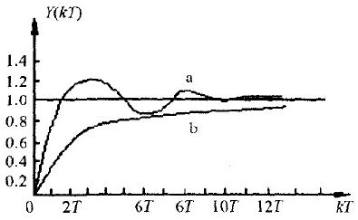 恒偏差法和有效偏差法相類似。有效偏差法又叫逆算法。即當(dāng)控制量Uk越限時(shí),Uk取邊界值Umax或Umin.由該邊界值逆算出偏差值Ek''代替原來的偏差值Ek.然而,在恒偏差法中,是用經(jīng)過衰減后的Ek''去代替Ek.系統(tǒng)在階躍響應(yīng)時(shí),實(shí)際工作在過阻尼狀態(tài),從而減緩了在起、停時(shí)對(duì)主電路器件的沖擊。圖3示出兩種算法的階躍輸入響應(yīng)曲線。其中曲線(a)標(biāo)準(zhǔn)PI算法響應(yīng)曲線、曲線(b)恒偏差法響應(yīng)曲線。
