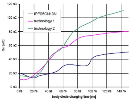 對于優(yōu)化能效,MOSFET內(nèi)部的體二極管具有關(guān)鍵作用。在每個(gè)開關(guān)循環(huán)中,在MOSFET被關(guān)斷之前,體二極管通常會通電,反向恢復(fù)電荷Qrr*也由此積聚起來。在第3節(jié)中已經(jīng)提到,數(shù)據(jù)手冊中所載Qrr與實(shí)際Qrr*有所出入。數(shù)據(jù)手冊中的值是按di/dt為100 A/μs測得的,二極管被施以最高漏極電流,并且MOSFET關(guān)斷前的導(dǎo)通時(shí)間長達(dá)500 μs左右甚至更長。因此,所測得的值是盡可能最高的Qrr*。此外,JEDEC標(biāo)準(zhǔn)所規(guī)定的測定方法不僅包含了Qrr*,而且包含MOSFET的部分輸出電荷,因而得到的總值很高,與實(shí)際值不相符。需要強(qiáng)調(diào)的是,雖然在實(shí)際應(yīng)用中,di/dt可能高達(dá)1000 A/μs,并且di/dt越高,Qrr*也越高。但是,Qrr*主要取決于電流和二極管導(dǎo)通時(shí)間。由于在實(shí)際應(yīng)用中,電流僅為最高漏極電流的一半甚或更低,并且二極管導(dǎo)通時(shí)間僅為50 ns至150 ns,因此實(shí)際Qrr*值比數(shù)據(jù)手冊中的值低得多。
