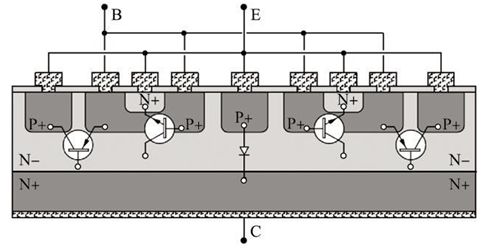 采用鉗位型開(kāi)關(guān)晶體管也能降低開(kāi)關(guān)晶體管的關(guān)斷延時(shí), 其原理是通過(guò)鉗位電路使VBC在晶體管導(dǎo)通時(shí)不能增加到深飽和所需的0. 7 V, 這樣注入集電結(jié)兩側(cè)的少子很少, 使超量?jī)?chǔ)存電荷很少, 這樣儲(chǔ)存時(shí)間大大縮短。采用鉗位型開(kāi)關(guān)晶體管主要有兩種, 一種是在集電結(jié)并聯(lián)肖特基二極管的晶體管,由于在高溫下漏電電流較大, 其ts - Vcesat的Trade??o ff關(guān)系最差, 目前應(yīng)用較少。另一種是橫向PNP鉗位型晶體管, 其結(jié)構(gòu)圖如圖6所示, 它在高溫下漏電較小, 能得到較好的Trade-off關(guān)系,電流放大系數(shù)基本不變, 目前得到了越來(lái)越多的應(yīng)用, 如吉林華微電子股份有限公司研發(fā)的產(chǎn)品3DD13003A 就采用了這種結(jié)構(gòu)。