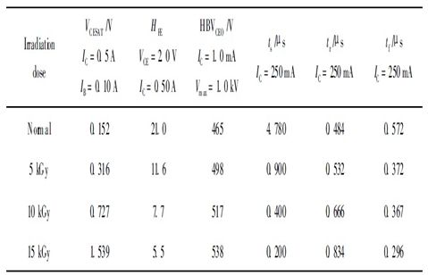從表1中我們可以看到, 經(jīng)過(guò)輻照后, 儲(chǔ)存時(shí)間ts 隨著輻照劑量的增大有很大幅度的減小, 下降時(shí)間tf 有所減小, 上升時(shí)間tr 有所增加; 電流放大系數(shù)隨著輻照劑量的增加而下降; 飽和壓降和擊穿電壓HBVceo隨輻照劑量的增大而增大。