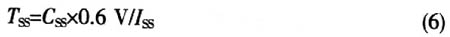 該器件無允許快速啟動的內(nèi)部軟啟動,但是也會產(chǎn)生大的浪涌電流。因此,對于需要降低浪涌電流的應用,該器件有限制DC/DC轉(zhuǎn)換調(diào)節(jié)器啟動時浪涌電流的電路。浪涌電流限制電路可作為軟啟動。外部的SS引腳用來調(diào)節(jié)軟啟動的特殊應用。電流ISS影響外部軟啟動電容器CSS,軟啟動時間計算為:
