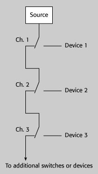 層疊開(kāi)關(guān)架構(gòu)是多位置開(kāi)關(guān)的一種替代形式。它采用多個(gè)繼電器將一個(gè)輸入連接到多個(gè)輸出。路徑長(zhǎng)度(同時(shí)決定了相位延遲)是由信號(hào)經(jīng)過(guò)的繼電器的數(shù)量決定的。