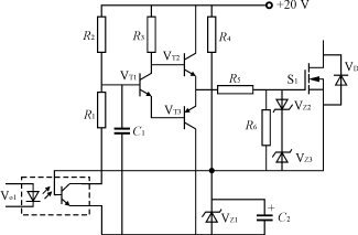 設(shè)計(jì)的驅(qū)動(dòng)電路如圖5所示,它由驅(qū)動(dòng)脈沖放大和5V基準(zhǔn)兩部分組成。脈沖放大包括光耦Vo1,R1和R2,中間級的VT1,推挽輸出電路VT2和VT3,對高頻干擾信號(hào)進(jìn)行濾波的C1;5V基準(zhǔn)部分包括R4,VZ1和C2,它既為MOS管提供-5V的偏置電壓,又為輸入光耦提供副邊電源。其工作原理是: