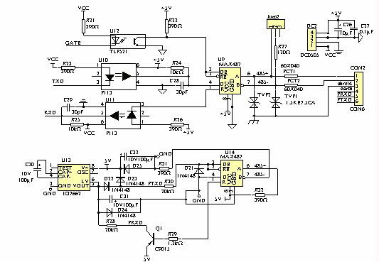 圖2為接口電路的原理圖。在圖中的上半部分用美國Maxim公司的485芯片MAX487構(gòu)成標準RS-485接口電路,其中2片P133為快速光電耦合器,用于把控制內(nèi)核部分與網(wǎng)絡隔離開,控制端口用相對廉價一點的TPL521隔離。TVS1和TVS2為瞬態(tài)電壓抑制二極管,用以對網(wǎng)絡上的高壓噪音干擾進行吸收,保護接口芯片MAX487免予損壞。PCT1和PCT2為自復位保險絲,在網(wǎng)絡過流的情況下起保護作用。在網(wǎng)絡過流時進入高阻限流狀態(tài),在網(wǎng)絡恢復正常的情況下,又恢復到正常零電阻的工作狀態(tài)下。R7為可選終端匹配電阻。該接口電路簡單、可靠。