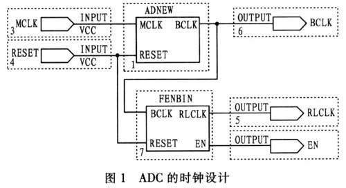 圖1示出A/D轉(zhuǎn)換器的輸入時鐘設計,MD轉(zhuǎn)換器工作在從模式下時,需要外部提供RLCLK和BCLK。在主時鐘MCLK的輸入下,通過對MCLK 4分頻得到BCLK的信號,用來作為位數(shù)據(jù)提取的信號。RLCLK是通過對BCLK的32分頻得到的,用來區(qū)分左右通道的數(shù)據(jù),同時輸出EN信號作為后續(xù)處理的同步信號。