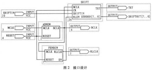 在圖2中,輸入為MCLK(主時鐘)、RESET(啟動信號)和SHIFTIN(A/D輸出數(shù)據(jù)),輸出為RL(左右?guī)盘?、BCLK(A/D數(shù)據(jù)位時鐘),TXT(并行數(shù)據(jù)讀取控制)和SHIFTOUT(并行數(shù)據(jù)輸出)。通過時鐘控制輸出BCLK和 RLCLK到AD1871,AD1871傳出數(shù)據(jù)SHIFTIN進入SHIFT模塊,SHIFT模塊在正確的位時鐘下讀取SHIFTIN的輸入數(shù)據(jù),并進行串,并轉(zhuǎn)換,之后輸出8位或12位的數(shù)據(jù)。同時輸出TXT并行數(shù)據(jù)讀取控制。