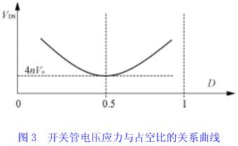 上式說(shuō)明,當(dāng)變壓器匝比愈小時(shí),對(duì)于一定的輸入電壓和輸出電壓的變換器,開(kāi)關(guān)管電壓應(yīng)力vds愈小。所以,有源鉗位正激變換器一個(gè)顯著優(yōu)點(diǎn)是可以降低開(kāi)關(guān)管電壓應(yīng)力,從而可選用額定電壓較低、通態(tài)電阻較小的功率開(kāi)關(guān)管。另外,當(dāng)變壓器變比n確定后,開(kāi)關(guān)管電壓應(yīng)力僅與占空比有關(guān),如圖3所示。顯然,當(dāng)占空比為0.5時(shí),開(kāi)關(guān)管承受最小的電壓應(yīng)力。當(dāng)輸入電壓變化時(shí),如果將占空比設(shè)計(jì)運(yùn)行在以0.5為中心的對(duì)稱(chēng)范圍內(nèi),則可使開(kāi)關(guān)管承受的電壓應(yīng)力基本保持恒定。