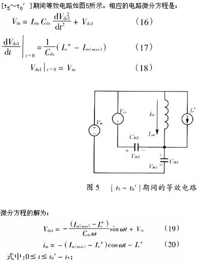 當(dāng)輔助開(kāi)關(guān)sa斷開(kāi)后,由于磁飽和電感l(wèi)s瞬間相當(dāng)于開(kāi)路,因此變壓器勵(lì)磁電流可完全用來(lái)對(duì)cds2和cds1充放電。[t4~t5]、[t5~t0′]期間,等效電路同圖4。顯然,令式(21)和(24)中io*或io為零,即可得到主開(kāi)關(guān)管零電壓導(dǎo)通的能量條件和時(shí)間條件,im(max)≥cdsωvin,即:
