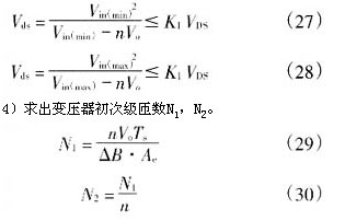 4)據(jù)式(29)、(30)求出變壓器初次級(jí)匝數(shù)n1,n2分別為40匝和3匝。