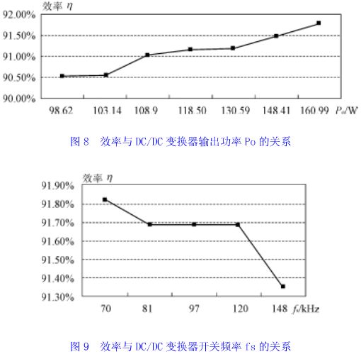 圖7(a)、7(b)、7(c)給出了實(shí)測(cè)的主開(kāi)關(guān)管工作電壓、電流波形。圖7(a)顯示主開(kāi)關(guān)管工作在硬開(kāi)關(guān)狀態(tài)。圖7(b)和圖7(c)分別是采用增加勵(lì)磁電流方法和應(yīng)用磁飽和電感器方法實(shí)現(xiàn)零電壓軟開(kāi)關(guān)的電壓電流波形,后者明顯地降低了勵(lì)磁電流和開(kāi)關(guān)管電流的峰值。實(shí)測(cè)波形與理論分析完全一致。圖8、9顯示出了實(shí)測(cè)的效率曲線(xiàn)。從圖9中看出,當(dāng)變換器開(kāi)關(guān)頻率增加時(shí),變壓器勵(lì)磁電流損耗和開(kāi)關(guān)管通態(tài)損耗所占比重增加,變換器效率降低了。實(shí)驗(yàn)結(jié)果驗(yàn)證了理論分析。