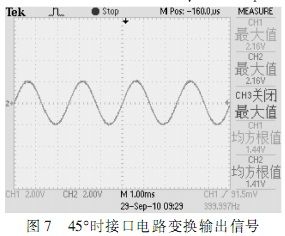 根據(jù)圖中所示,在確定的角度下,自整角機(jī)三路線線信號在電壓上呈120°正弦關(guān)系,接口電路轉(zhuǎn)換輸出信號為兩路電壓正交信號,根據(jù)角度不同,兩路信號電壓峰值不同,單路最大時電壓為2Vrms。測試結(jié)果完全符合設(shè)計要求。