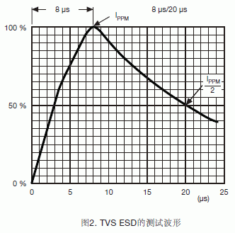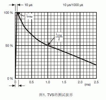 TVS的額定功率是在一定測試或應(yīng)用條件下吸收浪涌的能力。10μs/1000μs脈沖波形的工業(yè)標準測試條件(Bellcore 1089標準)如圖1所示。這個測試條件不同于8μs/20μs脈沖波形的TVS瞬態(tài)電壓吸收能力測試條件,如圖2所示。