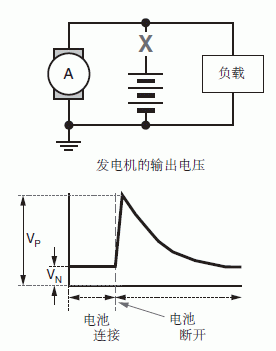 最糟糕的浪涌電壓發(fā)生在引擎運轉(zhuǎn)時電池斷開,交流發(fā)電機為汽車電源線提供電流時,這種情況就是所說的“甩負荷”。大多數(shù)汽車制造商和工業(yè)協(xié)會都會為這種甩負荷狀態(tài)制定最高電壓、線路阻抗和這種甩負荷狀態(tài)的持續(xù)時間,如圖5所示。甩負荷的電源阻抗會高于正常瞬態(tài)測試時的電源阻抗,因為電池斷開而只有發(fā)電機在向外輸出電能,這時交流發(fā)電機的內(nèi)部線圈相當于一個限流電阻。