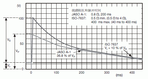 兩個熟知的試驗?zāi)M了這個條件:針對14V動力總成的美國ISO-7637-2 Pulse 5和日本JASO A-1和針對27V動力總成的JASO D-1。在本節(jié)中,我們將回顧在14V動力總成中用于甩負荷的TVS應(yīng)用。
