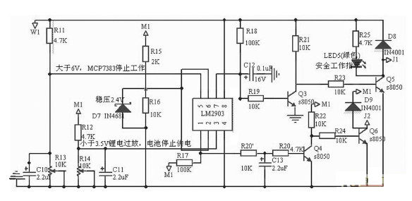 當鋰電池電壓低于315V 時,即電池電量釋放92%以上時,認為不能繼續(xù)放電,否則鋰電池內部介質會發(fā)生變化,致使充電特性變壞,容量降低等。 為此設計過放電保護控制電路,此電路的具體設計如圖3,分析如下:采用了LM 2903的1, 2, 3腳組成的一路比較器,與外圍器件構成過放電壓比較器, R12 , R14分壓后接至LM 2093的3腳。 當電壓值小于315V 時,分壓值小于214V, LM 2903的1腳由高電平轉變?yōu)榈碗娖剑?Q4 由導通轉變?yōu)榻刂範顟B(tài), Q6 飽和導通, JDQ2工作,同時過放紅色指示燈亮。