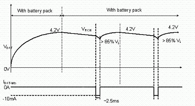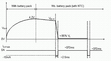 使用者亦有可能在充電或式充電完畢后,在未將電源移除的情況下,即抽離電池的情況。為避免造成危險,IC內(nèi)部應具有如圖7, 8的電池存在偵測機制。充電IC會以短時間脈沖(每370ms產(chǎn)生2ms的脈沖)方式抽取電池電流,此時若電池存在,則偵測到的電池電壓應大于一預設閥值;若電池已切離,則充電IC偵測到一低電壓,即可判定為電池斷開狀態(tài),并將電池端電壓切斷,保護使用者安全。