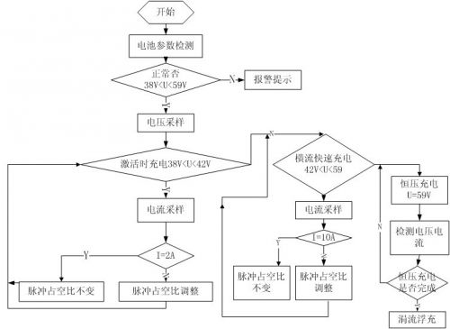 激活充電:充電器開(kāi)始工作后單片機(jī)采集采集蓄電池端電壓檢測(cè),若電壓過(guò)低說(shuō)明曾過(guò)度放電,為避免充電電流過(guò)大,實(shí)行小電流激活。