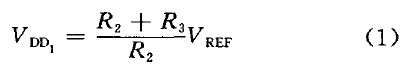 時(shí),比較器跳轉(zhuǎn),N1開(kāi)通,UVLO-out開(kāi)始變l.通過(guò)合理設(shè)置R1、R2、R3值就可以使VDD1=9.5 V,VDD2=7V,即VDD上升到9.5 V時(shí)UVLO輸出為零,芯片正常工作; VDD下降到7 V 時(shí)芯片停止工作。