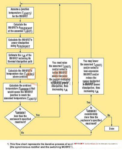 再參考圖1說(shuō)明,確定是否正確選擇了用于同步整流器和開關(guān)MOSFET的MOSFET迭代過(guò)程的下一個(gè)步驟。這一步驟計(jì)算每個(gè)MOSFET的環(huán)境空氣溫度,它可能導(dǎo)致達(dá)到假設(shè)的MOSFET結(jié)溫。為此,首先要確定每個(gè)MOSFET的結(jié)與環(huán)境間的熱阻(ΘJA)。