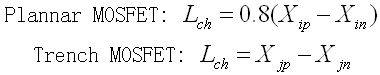 可見(jiàn)閾值電壓主要與基區(qū)摻雜濃度(p-)、柵氧化層厚度(Toxg)、耗盡層電荷(Qdep)相關(guān)。式中前兩項(xiàng)因子對(duì)Trench MOSFET和Plannar MOSFET而言相同,而第三項(xiàng)則不同,因?yàn)楹谋M層電荷與溝道長(zhǎng)度有關(guān),兩者的溝道長(zhǎng)度表達(dá)式為