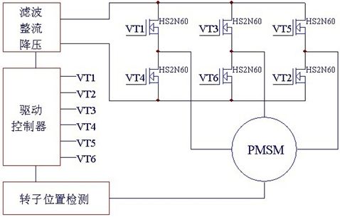 方案中無(wú)刷直流電機(jī)(BLDCM)輸入(110V/220V)交流電,經(jīng)轉(zhuǎn)換器(converter)轉(zhuǎn)成直流,要轉(zhuǎn)入電機(jī)線圈前須先將直流電壓由換流器(inverter)轉(zhuǎn)成3相電壓來(lái)驅(qū)動(dòng)電機(jī)。換流器(inverter)由6個(gè)功率MOSFET(VT1~VT6)分為上臂(VT1、VT3、VT5)/下臂(VT2、VT4、VT6)連接電機(jī)作為控制流經(jīng)電機(jī)線圈的開(kāi)關(guān)。MCU提供PWM(脈沖寬度調(diào)制)決定功率MOSFET HS2N60IB開(kāi)關(guān)頻度及換流器(inverter)換相的時(shí)機(jī)。