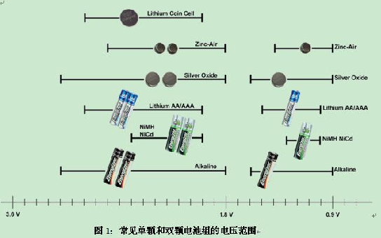 多數(shù)低端和中端便攜式產(chǎn)品都會(huì)使用可替換的電池或充電電池,這些電池還能由使用者自行更換。如圖1所示,剛充完電時(shí)的單節(jié)電池電壓通常會(huì)在1.2-1.6V之間,電力耗盡時(shí)則下降至0.9-1.0V。把兩個(gè)單節(jié)電池串聯(lián)即可提供1.8-3.2V之間的電壓。