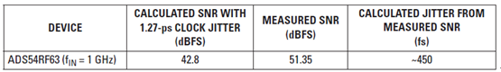利用調(diào)節(jié)后的相位噪聲曲線圖,計(jì)算得抖動(dòng)較好地匹配了 SNR 測(cè)量結(jié)果,其在 ADS54RF63 和 ADS5483 的 10 到 30 fs 范圍內(nèi)(參見(jiàn)表 8)??紤]到在第三諧波周圍可能存在相位噪聲的較小時(shí)鐘抖動(dòng)影響,該計(jì)算得 SNR 只是一種非常接近的估算結(jié)果。