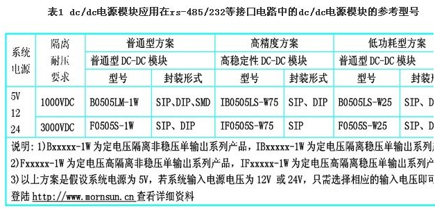 (4) DC/DC電源模塊應(yīng)用在rs-485/232等接口電路中的DC/DC電源模塊的型號(hào)參考,如表1所示?! ?br />