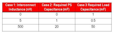 表1對舉例系統(tǒng)三個互連電感的要求電容器進行了比較。通過改變互連電感、計算負載旁路電容并設(shè)計電源的相應(yīng)輸出級和控制環(huán)路,得到比較數(shù)據(jù)。案例1的負載和電源并列放置;案例2電源和負載之間的互連電感大小為中等。案例3中,使用線纜連接的電源的電感極高。要求旁路的多少直接與互連電感有關(guān)。
