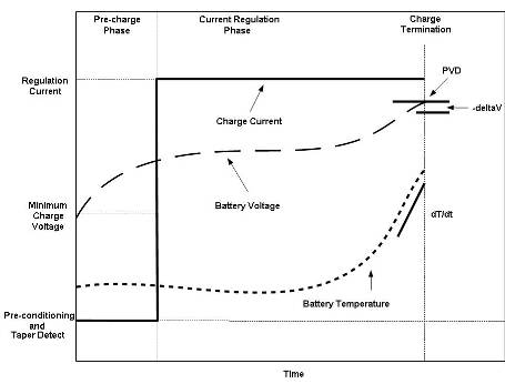當(dāng)電池溫度和電壓正確時快速充電開始。通常用 1C 或更低的恒定電流對 NiMH 電池進(jìn)行充電。一些 NiCd 電池可以用高達(dá) 4C 的速率進(jìn)行充電。采用適當(dāng)?shù)某潆娊K止來避免有害的過充電。