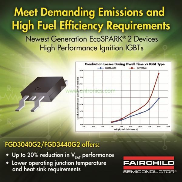 為了滿足現(xiàn)今和新興點(diǎn)火系統(tǒng)對排放和高燃油效率的嚴(yán)苛要求,汽車設(shè)計(jì)人員需要更高性能的點(diǎn)火線圈驅(qū)動器技術(shù)。為幫助設(shè)計(jì)人員滿足這些要求,飛兆半導(dǎo)體公司推出了在較小的占位面積下具有更低功耗的最新一代點(diǎn)火IGBT器件。EcoSPARK2、FGD3040G2和FDG3440G2點(diǎn)火線圈驅(qū)動器可將VSAT降低多達(dá)20%,而不會顯著降低自箝位感性負(fù)載開關(guān)(Self Clamping Inductive Switching, SCIS) 的能量。這項(xiàng)優(yōu)化特性減低了功耗和工作結(jié)溫,并降低了對散熱器的要求。
