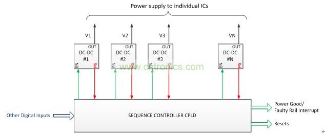 一個實現(xiàn)復(fù)雜的電源管理的常用方法(圖2)是使用DC-DC轉(zhuǎn)換器的電源良好信號,以監(jiān)測這個電源,并使用CPLD來實現(xiàn)定序算法(控制DC-DC轉(zhuǎn)換器的使能信號)。CPLD也產(chǎn)生監(jiān)測信號,如電源就緒/故障電壓中斷和復(fù)位信號。